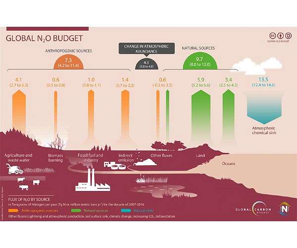 Concentration of dinitrogen oxide – also referred to as nitrous oxide – in the atmosphere increases strongly and speeds up climate change. In addition to CO2 and methane, it is the third important greenhouse gas emitted due to anthropogenic activities. Human-made nitrous oxide emissions are mainly caused by the use of fertilizers in agriculture. Growing demand for food and feed in future might f