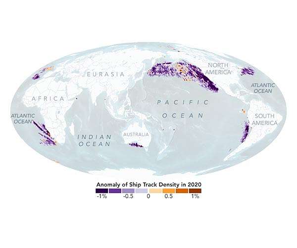 A global standard limiting sulfur in ship fuel reduced artificial “ship track” clouds to record-low levels in 2020. Pandemic-related disruptions played a secondary role.